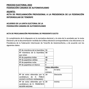 Publicamos el acta emitida por la junta Electora de la Federación Canaria de Automovilismo de la proclamación del presidente de la Federación Interinsular de Automovilismo de Santa Cruz de Tenerife (FIASCT).
