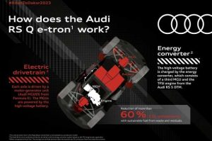- El Audi RS Q e-tron se comporta como un coche eléctrico con batería, que no se alimenta enchufándola, sino con la electricidad producida por un convertidor de energía instalado a bordo.