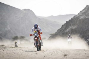 Las lluvias de los últimos días dejaron la arena muy húmeda y las huellas de los pilotos que abrieron pistan fueron aprovechadas por el resto. Ricky Brabec (Honda) salió primero tras su triunfo, con ayuda de las penalizaciones, el domingo.