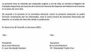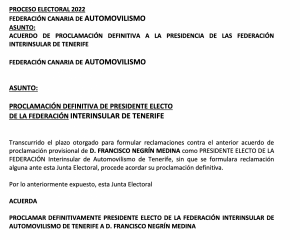 Publicamos el acta de proclamación definitiva de Francisco Negrín Medina como presidente electo de la Federación de Automovilismo de Santa Cruz de Tenerife, cargo que ha venido ostentando hasta la fecha y en el que seguirá cuatro años más.