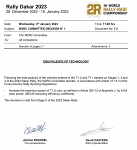 «Siguiendo el análisis de los datos de los coches de las categorías T1U y T1+ en las tres primeras etapas del Dakar 2023, el Comité del W2RC decide, en concordancia con el Artículo V1 13.3 del Reglamento Deportivo de los Rallyes Cross-Country, incrementar la potencia máxima de los T1U en ocho kilovatios», detalló el W2RC.