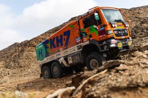 De vuelta a la cabina, la tripulación del KH-7 Epsilon Team ha tomado una decisión estratégica, que detalla Jordi Juvanteny: “Funcionaba sólo uno de los dos amortiguadores que trabaja en la rueda delantera derecha, por lo que lo más sensato era bajar el ritmo para conservar el camión y poder llegar al final de la especial”. El equipo trabaja en estos momentos a contrarreloj en las dos horas disponibles para solucionar la avería. A fin de optimizar el tiempo disponible, se retirará un amortiguador de las ruedas traseras, menos exigida en las especiales, para permitir disponer de doble suspensión en el eje delantero.