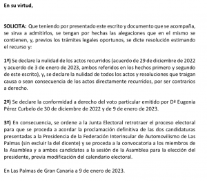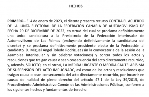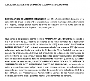 El candidato a la presidencia de la Federación Miguel Ángel Domínguez ha presentado una ampliación del recurso para poder presentarse como presidente de la Federación de Automovilismo de Las Palmas.