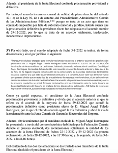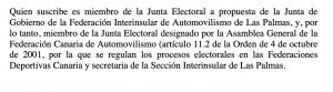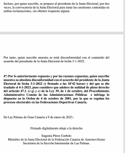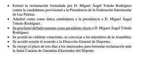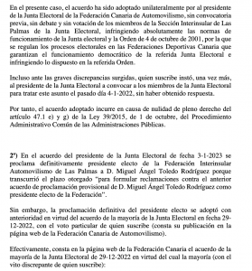 Otro voto particular de Eugenia Pérez, donde muestra su disconformidad con la proclamación de Miguel Ángel Toledo como presidente de la FALP, por lo que será la Junta de Garantias del Gobierno de Canarias la que dictamine si hay o no hay elecciones para nombrar presidente de la Federación de Automovilismo de Las Palmas.