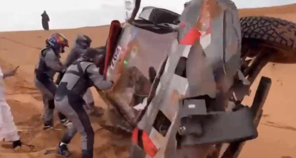 El coche aterrizó de morro tras una duna y dio una vuelta de campana y, aunque en un primer momento se informó que tanto Sainz como su copiloto, Lucas Cruz, se encontraban bien, los organizadores precisaron después que el piloto presentaba dolor en la zona del tórax.