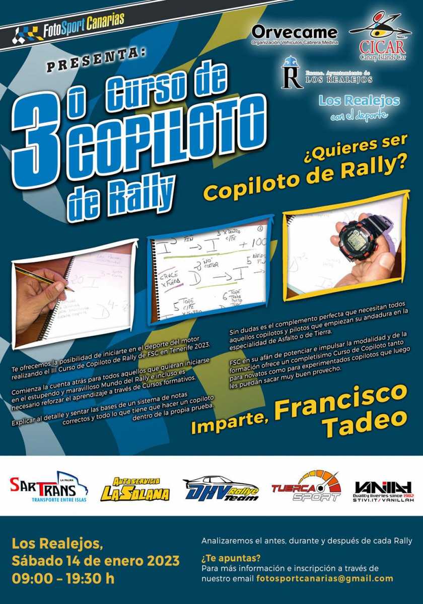 La 3º edición del Curso de Copiloto de FSC que se celebrará el próximo sábado 14 de enero en la Casa de La Parra en Los Realejos bajo, en Tenerife y la 3º edición del Curso de Copiloto de FSC que se celebrará el próximo sábado 21 de enero en la Casa de La Parra en Los Realejos bajo, en Tenerife está diseñado y orientado para todo el mundo. Bien sean copilotos con experiencia, o alumnos que estén interesados. Al igual que el año pasado, será impartido por el mismo copiloto profesional Francisco Tadeo, quien será el encargado de enseñar a preparar y a actuar en una prueba, al máximo detalle.