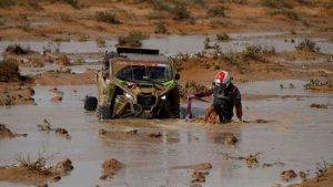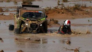 En un Dakar que cada día depara alguna sorpresa, la lluvia ha vuelto a convertirse en un factor inesperado para los pilotos en la reanudación de la carrera después de la jornada de descanso en Riad. Tras unos cordones de dunas al principio, la primera parte de la especial incluía el paso por pistas dentro de ríos secos, que se han inundado con el aguacero. Antes de la neutralización en el kilómetro 162, Font rodaba detrás de unos camiones y no ha podido evitar quedar encallado en el agua y el barro. «Conducíamos dentro de las roderas de los camiones, a poca velocidad dentro del río, y al final hemos quedado enganchados», explica el piloto de Vic.