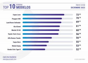 En lo que a la clasificación de los modelos con mayor puntuación en el índice GEOM Index, el Cupra León se ha hecho con la primera plaza gracias, principalmente, al lanzamiento de la nueva versión 1.5 eTSI 150 CV DSG. Un modelo en el que los internautas han valorado la combinación de la inata deportividad que rodea a toda creación de la marca española, con la eficiencia y versatilidad de uso que le proporciona su motor con tecnología de hibridación ligera que le convierte en el primer Cupra con la etiqueta ECO de la DGT. Un dato muy significativo si tenemos en cuenta la preocupación existente entre los conductores ante la puesta en marcha en 2023 de las zonas de Bajas emisiones (ZBE) en las grandes ciudades.