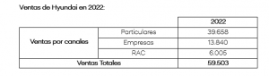 El año 2022, año en el que Hyundai celebra su 30 Aniversario desde la implantación en 1992, ha supuesto para Hyundai Motor España la consecución de importantes hitos en el mercado español donde los resultados comerciales han alcanzado récords históricos para la empresa surcoreana. Las ventas totales han ascendido a 59.503 vehículos matriculados, lo que representa una cuota de mercado record del 7,32% y un crecimiento del 3,5%, en un mercado que ha caído el 5,4%. Con estos resultados Hyundai ha finalizado el año en la tercera posición del mercado global.