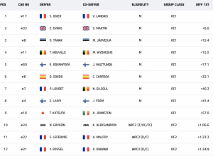 A sólo una décima de segundo se encuentra la estrella de Hyundai, Thierry Neuville, que perdió unos ocho segundos al calar su i20 N tras derrapar en una placa de hielo negro. El piloto privado de Puma Jourdan Serderidis se salió en la misma curva pero le fue mucho peor, perdiendo más de un minuto mientras los espectadores sacaban su coche de una zanja.