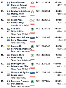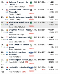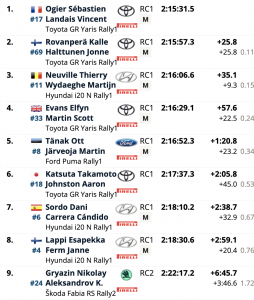Takamoto Katsuta, que también pilotaba un Yaris, adelantó a Dani Sordo para completar los seis primeros puestos. Ambos están separados por 20,4 segundos, con el compañero de Sordo en Hyundai, Esapekka Lappi, a sólo 4,5 segundos en la octava posición de la general.