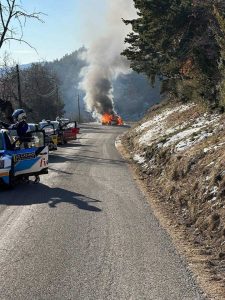 Mala suerte para los suizos Jonathan Hirschi y Michaël Volluz durante el Rally de Montecarlo al ver con impotencia cómo se quemaba su Volkswagen Polo GTI R5.