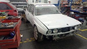 El piloto grancanario Miguel Quintino, junto a su copiloto, Carlos García, trabajan en las mejoras de su veterano BMW M3, como hacen en cada pretemporada los últimos años.