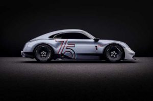 El logotipo del 75 aniversario adorna las puertas y la parte delantera como en un coche de competición. No es el único detalle procedente de las carreras; por ejemplo, no hay nada detrás de la zona inferior de las ruedas delanteras, lo que permite una mejor ventilación de los pasos de rueda. El capó delantero envolvente y sin juntas se sujeta con mecanismos de cierre rápido. Unas varillas roscadas estabilizan el gran spoiler delantero. En los estribos laterales, los diseñadores de Porsche han empleado polímero reforzado con fibra natural (NFRP), como en el Porsche Mission R, el prototipo de un GT de competición totalmente eléctrico presentado en 2021. La base de estos materiales sostenibles son las fibras de lino procedentes de explotaciones agrícolas. En lugar de retrovisores exteriores tradicionales, el concept car está equipado con cámaras en el borde del techo. La salida de escape visible en la parte trasera es de titanio de aspecto azulado, mientras que el interior del tubo de escape es cerámico.