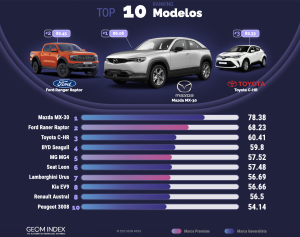 Los resultados de este primer estudio GEOM Index del año han vuelto a poner de manifiesto la creciente importancia del factor eléctrico en el sector de la automoción. Una afirmación que se sustente en el hecho de que modelos como el Toyota C-HR, el BYD Seagull, el MG4 o el Kia EV9 se hayan situado entre las 10 primeras posiciones por la valoración global obtenida.