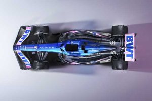 - La decoración es una impresionante mezcla del azul histórico de Alpine, que ha servido al motorsport durante cinco décadas, combinado con los llamativos colores rosa del patrocinador principal del equipo, BWT, así como un nuevo patrón decorativo cristalizado para simbolizar la procedencia de Alpine y sus raíces históricas en los Alpes.