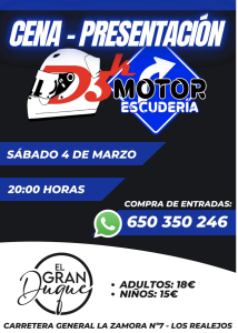 Con el fin de recaudar fondos para la Escudería Derecha3kmotor, dar muchos datos de lo que se realizará en este año 2023, y pasar un rato súper agradable, Derecha3Kmotor realizará, una cena presentación el próximo sábado, 4 de marzo, en @restaurante_elgranduque en Los Realejos.
