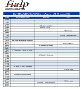 La Federaciรณn Insular de Automovilismo de La Palma informa que ยซdespuรฉs de haberse celebrado la asamblea de la FCA, actualizamos el calendario de fechas insular, que se presentarรก en la prรณxima asamblea de la Federaciรณn Insular. a celebrar el 25 de marzoยป.