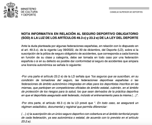 Publicamos la nota informativa del Consejo Superior de Deportes (CSD) en relación a los seguros de las licencias deportivas.