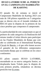 Hugo Latorre sube al podium en Madrid Por Rafa León Última actualización: 15/03/2023 11:47 Compartir FacebookTwitterWhatsAppEmailTelegramLinkedin El piloto grancanario Hugo Latorre ha logrado subirse al podium en el Campeonato Madrileño de Karting. Campeonato Madrileño de KartingCircuitoEspañaEuropaHugo LatorreKartingMadrid Compartir
