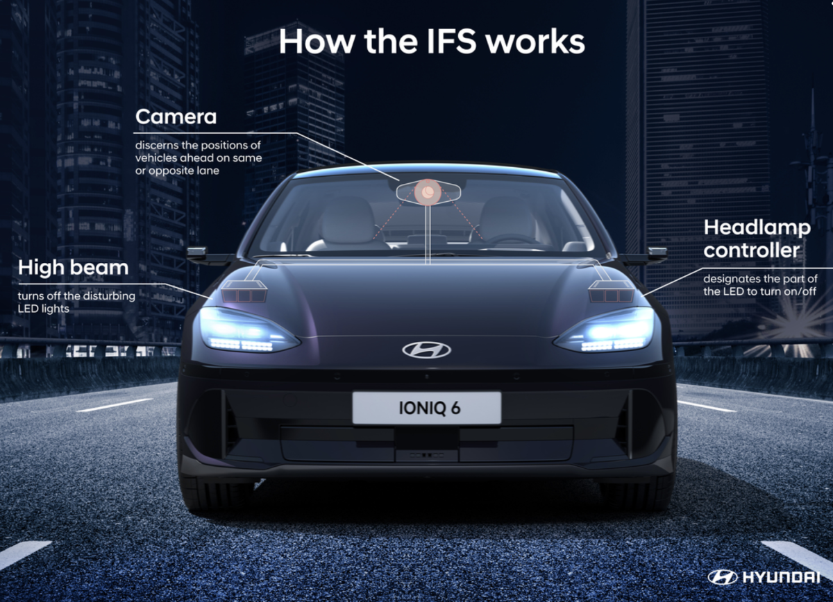 El IFS podría considerarse como una forma evolucionada de la característica de seguridad activa HBA (High Beam Assist), que también funciona para evitar la disminución de la visibilidad de otros usuarios de la carretera por la noche. Un HBA estándar funciona desactivando temporalmente la luz larga una vez que detecta un vehículo al frente o acercándose desde un carril opuesto, pero esto da como resultado una reducción temporal en la visibilidad del conductor, aunque solo sea por unos segundos. El sistema IFS aborda con éxito este problema, ya que apaga solo las partes de las luces largas que interrumpen la visión del otro conductor y, por lo tanto, el conductor del IONIQ 6 disfrutará de la máxima visibilidad en todo momento.