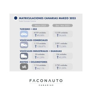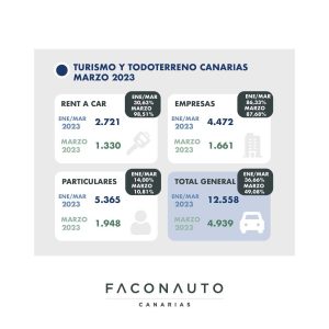 • Las matriculaciones del pasado mes de marzo en Canarias crecen un 49% respecto a marzo de 2022 con 4.939 turismos y todoterrenos matriculados. .
