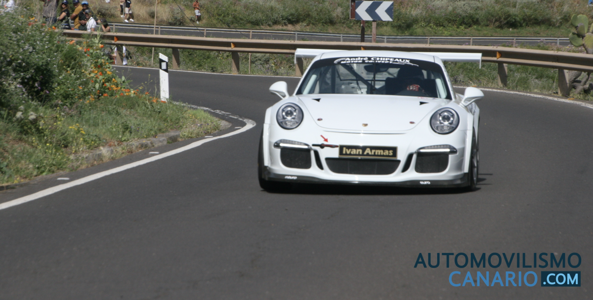 Iván Armas, segundo de la Subida Montaña Alta con su Porsche 911 GT3, se mostró “contento porque bajamos el récord de GT que yo tenía anteriormente. En todas las mangas hemos bajado nuestros cronos y en la última pasada fuimos los más rápidos y los únicos que mejoramos cuando el resto empeoró”, resumió para automovilismocanario.com.
