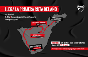 - El recorrido parte de Ducati Tenerife y concluye en el sur, concretamente en Arona, tras atravesar las Cañadas del Teide
