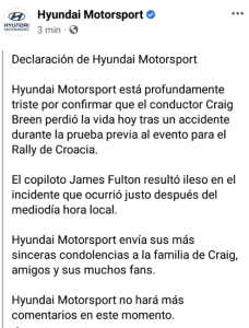La información ha ido llegando a cuenta gotas y ha costado hasta creerla, pero, lamentablemente se confirma que el piloto irlandés Craig Breen ha fallecido tras sufrir un accidente en las pruebas previas al Rally de Croacia, cuando pilotaba un Hyundai i20 N Rally1.