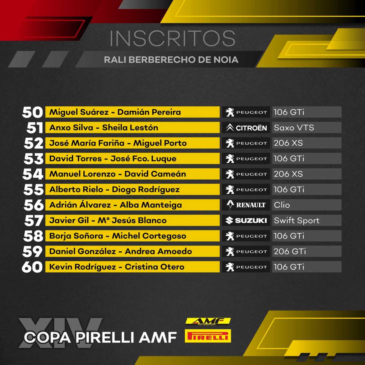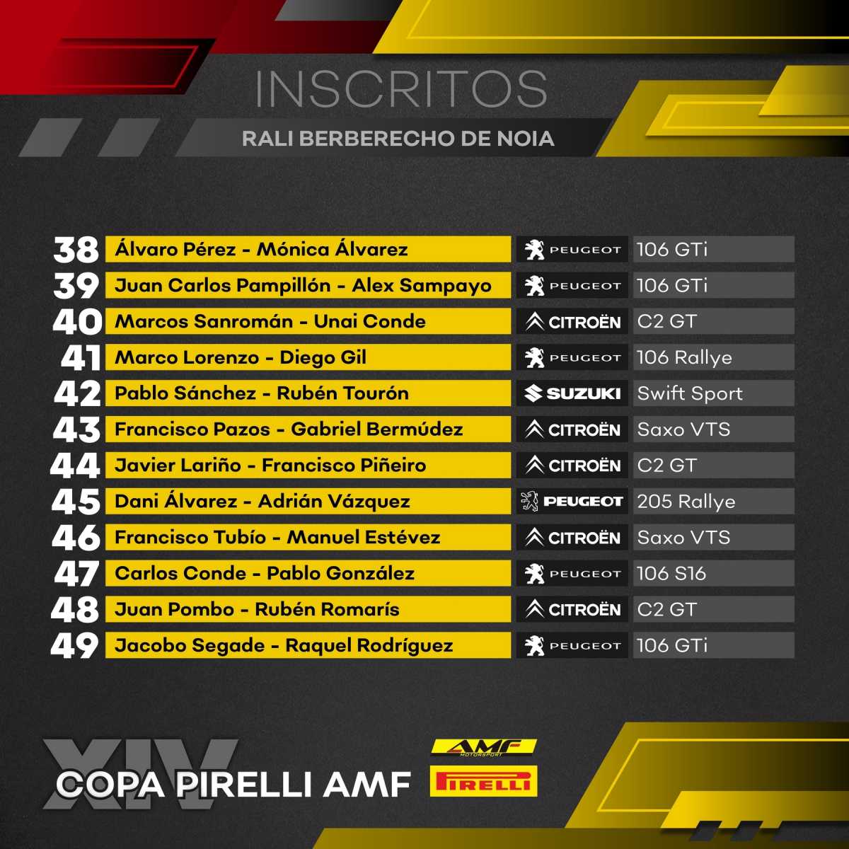 La Copa Pirelli AMF tendrá como claro favorito a Álvaro Pérez, que peleará con Juan Carlos Pampillón y Marcos Sanromán al igual que sucedió en A Coruña, con Fran Pazos tratando de resarcirse de su abandono en esa primera cita, al igual que el local Javier Lariño. Cabe tener muy en cuenta el regreso de Dani Álvarez y su afinado Peugeot 205 a esta copa, siendo otro de los claros candidatos al podio.