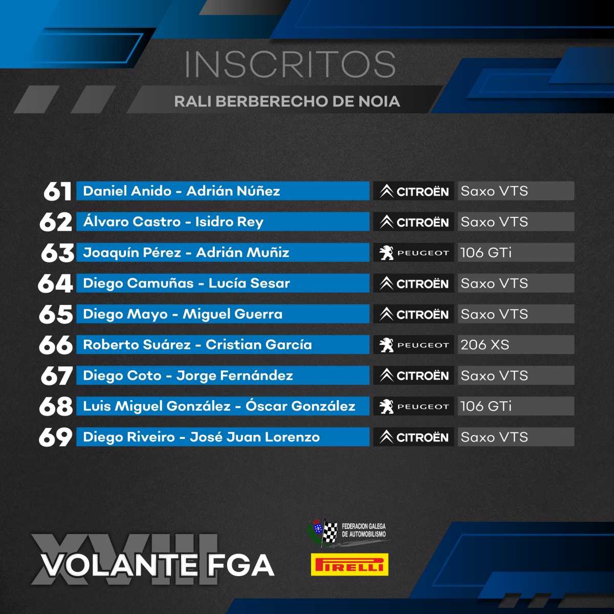 El Volante FGA bate su récord de inscripción de las últimas temporadas con nada menos que 18 equipos participantes, donde Daniel Anido, Álvaro Castro y Joaquín Pérez volverán averse las caras para arreglar las cuentas pendientes de la primera cita. Entre las nuevas incorporaciones, destaca Brais García, que logró el triunfo en el pasado Rallye Ribeira – Ría de Arousa.