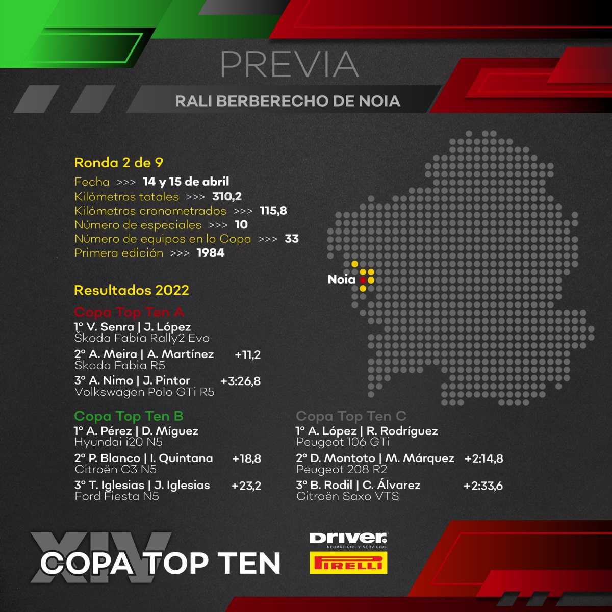 Después de un inicio de temporada bastante accidentado, la Top Ten «C» llega a Noia con Manuel Souto como líder, que se enfrentará a los rivales de la primera cita como Saúl Pensado, Rubén López o Javier Eiras, mientras que David Rivas estará presente con un Peugeot 208 tras el accidente que dejó muy maltrecho su C2 en la cita coruñesa. Cabe destacar el regreso de Raúl Martínez, subcampeón el año pasado, Miguel Caeiro o Benito Puceiro, pilotos habituales del certamen que se unen en esta segunda cita.