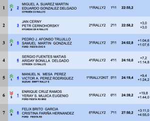 Si en el primer tramo era el tinerfeño Enrique Cruz y el grancanario Yeray Mujica, con el Ford Fiesta R5 MKII del equipo Disa Copi Sport, los que mandaban, en el segundo eran los checos Jan Cerny y Petr Černohorský, con el i20 N Rally de Hyundai Canarias Motorsport, los que marcaban el mejor crono y empataban al frente de la general, pero con el palmero Miguel Suárez y al grancanario Eduardo González, con el Citroën C3 Rally2 de Sports & You Canarias, a sólo 0.9 del liderato al ser los segundos más rápidos en la especial.