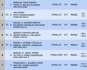 Los del Hyundai invirtieron un tiempo de 8:01.8, superando en la especial en 2.9 al palmero Miguel Suárez y al grancanario Eduardo González con el Citroën C3 Rally2 de Sports & You Canarias, siendo terceros los del Ford con 3.5 de pérdida.