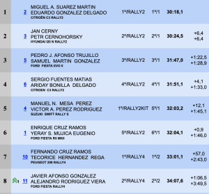 En un solo tramo ya tienen a su alcance a Manuel Mesa-Víctor Pérez (Suzuki Swift Rally S), quintos, y Sergio Fuentes-Ariday Bonilla (Citroën C3 Rally2), a los que superarán en la siguiente cronometrada.