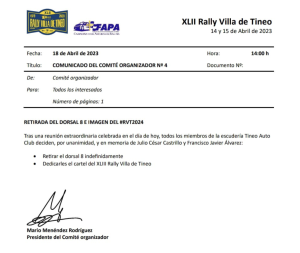 Todos los miembros de la Escudería Tineo Auto Club han decidido, por unanimidad, retirar de manera indefinida el número 8 del Rally Villa de Tineo en memoria por el fallecimiento el pasado fin de semana del piloto Julio César Castrillo, de 50 años, y el copiloto Francisco Javier Álvarez, de 46.
