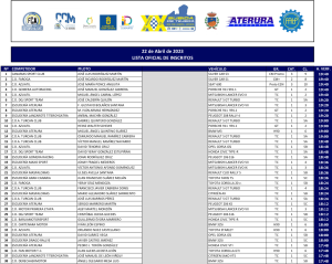 Tal y como se recoge en el Programa Horario, se ha procedido a publicar la Lista Oficial de Inscritos de la 20º Subida de Tejeda, que reúne a más de 70 equipos participantes que han querido responder a la prueba organizada por la Escudería Aterura.