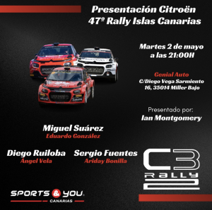 Este martes 2 de abril, a las 21:00 horas, en las instalaciones de Citroën Las Palmas en Miller Bajo, se presentará el Citroën C2 Rally2 del asturiano Diego Ruibola, que viene de ser tercero en el Rally del SuperCampeonato de España de Rallys en Lorca, el palmero Miguel Suárez, que viene de ganar el Rally Norte de Tenerife, primera cita del Campeonato de Canarias de Rallys, y el tinerfeño Sergio Fuentes, que fue tercero de esta cita del Regional.