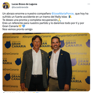 Lucas Bravo de Laguna, presidente de Unidos por Gran Canaria (UxGC)le ha mandado un mensaje lleno de cariño a su candidato a la presidencia del Cabildo de Gran Canaria, José María Ponce, que sufrió un accidente en el tramo de Gáldar, del Rally Islas Canarias.