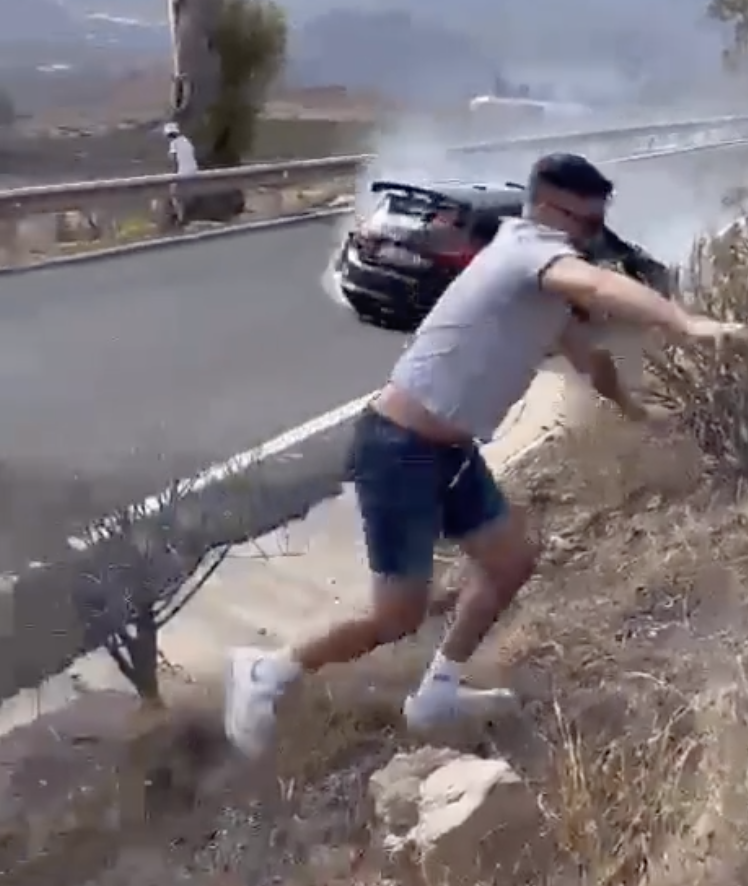 Un aficionado que se encontraba al borde de la carretera vio que los del Fiesta iban hacia su z0na, por lo que busco subir la montaña para evitar males mayores, para susto suyo, del piloto, copiloto y cámara…