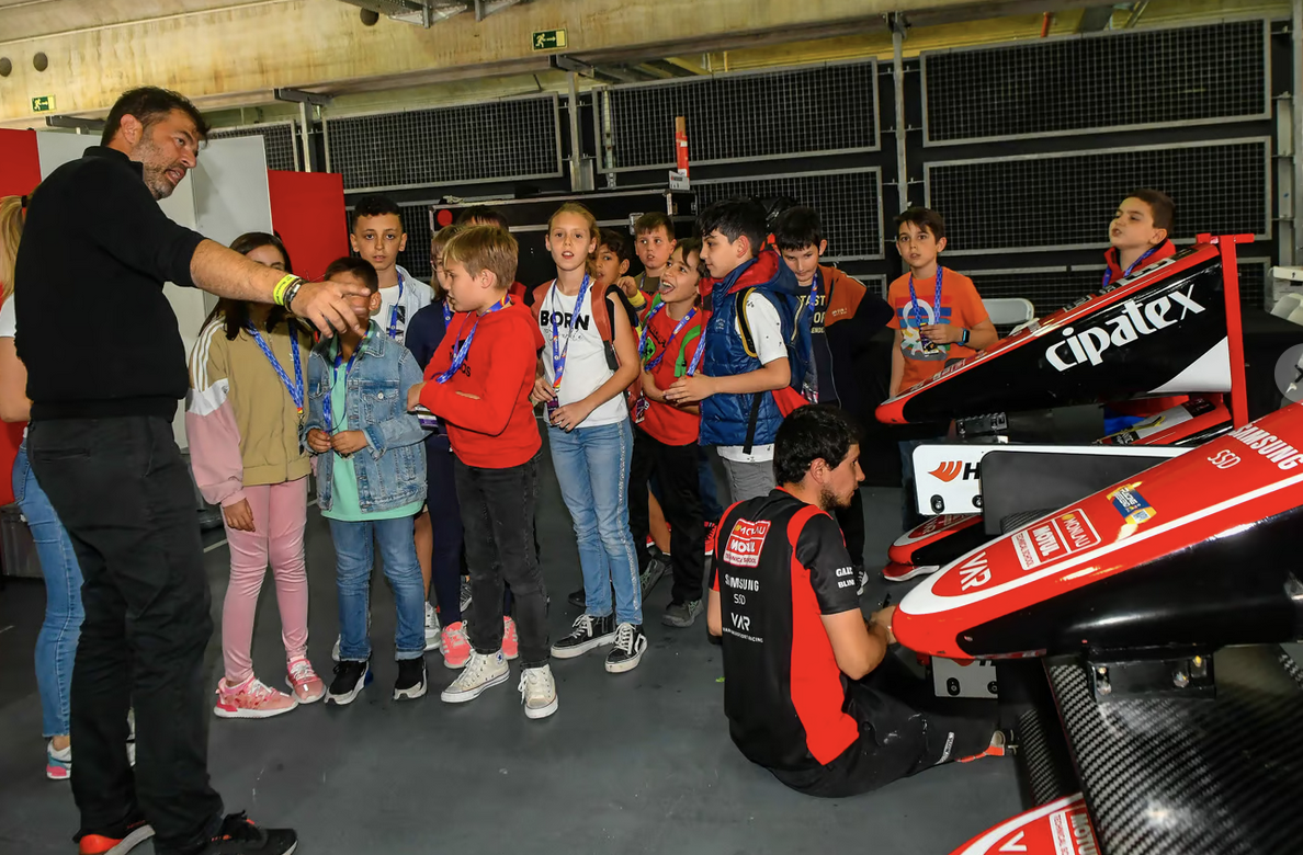 –La iniciativa «siéntete periodista» reunió en el circuito alcañizano a cien escolares de primaria para conocer cómo se trabaja durante un gran evento deportivo