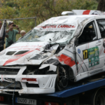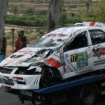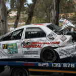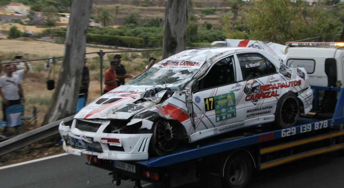 Alby Martel (Mitsubishi Lancer) dio el gran susto en la Subida de Arucas 2023 al volcar de manera espectacular con su montura. Por suerte, pudo salir por su propio pie a pesar de la espectacularidad del vuelco y del destrozo del coche tras varias vueltas de campana.