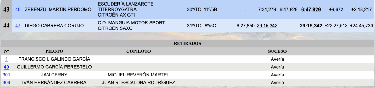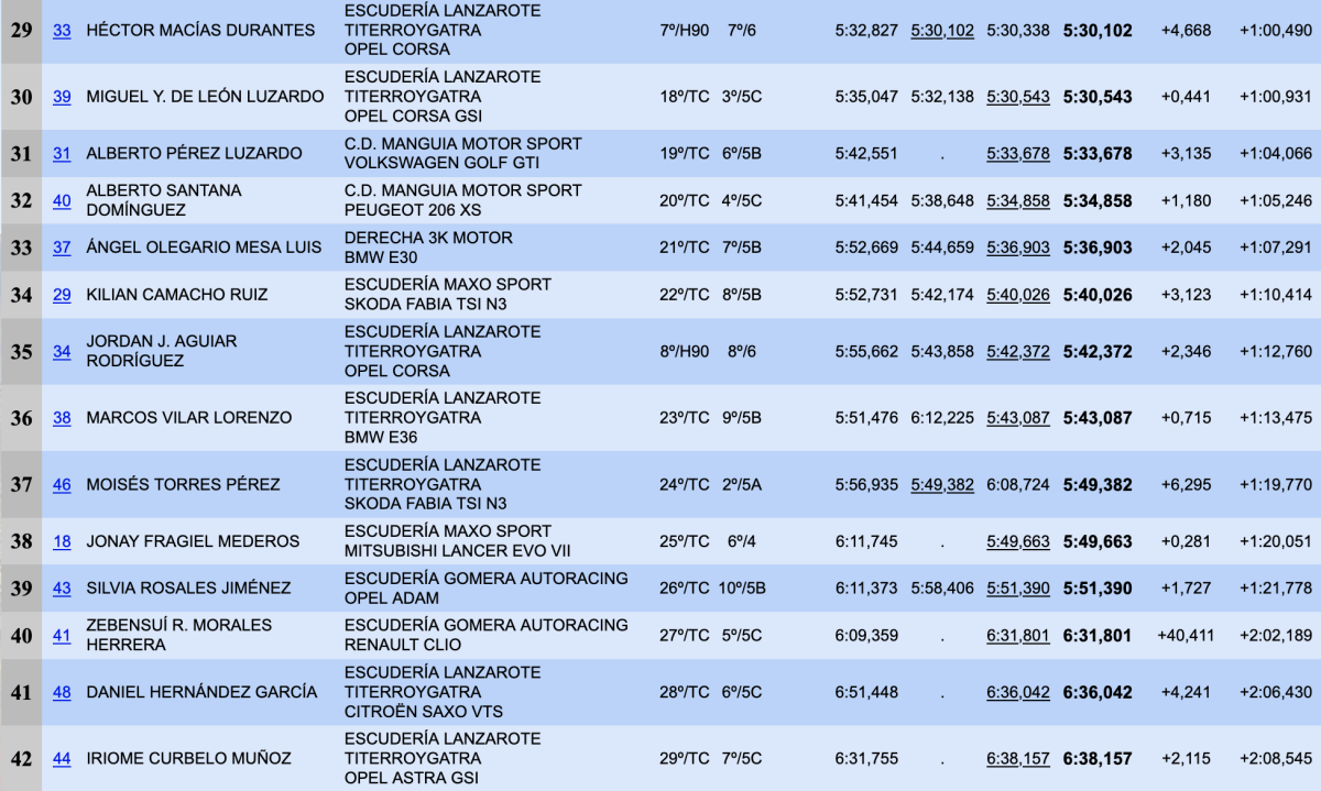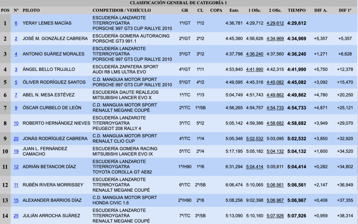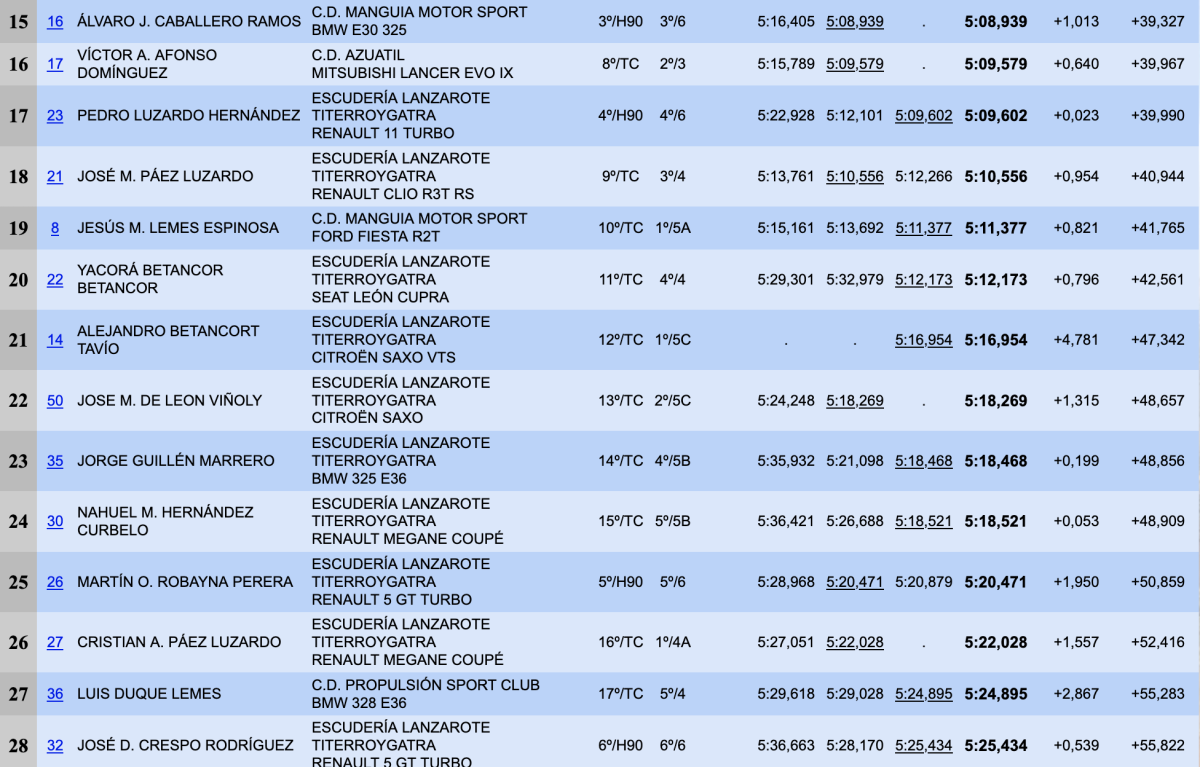 Otro lanzaroteño, Oliver Rodríguez, se alzaba con un quinto puesto que le supo a poco con otro de los Porsche 911 que protagonizaron la subida. Su crono a 15 segundos del tiempo de yeray Lemes no debería ser así. Y en la sexta plaza otro de los seguidores del Campeonato de Canarias, el también tinerfeño Abel Mesa con Mitsubishi Lancer Evo X. Muy buena subida de otro lanzaroteño «volador», Oscar Curbelo con el Renault Megane, séptimo y primero de los coches de tracción delantera. Por delante de otro prometedor Roberto Hernández, probando su Peugeot 208 Rally4.