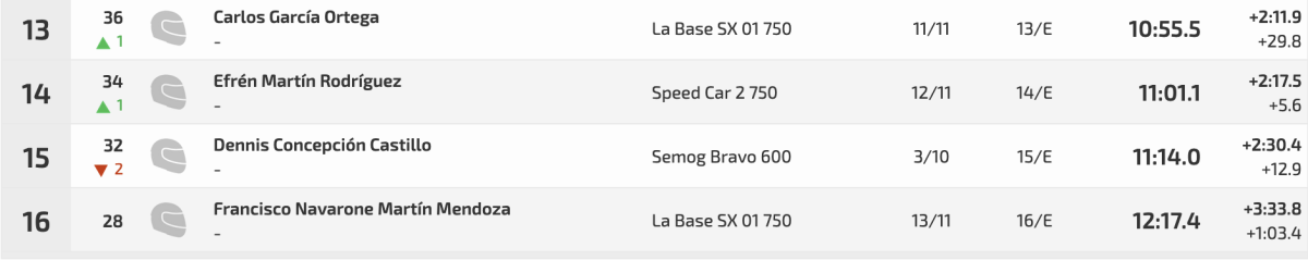 En el apartado Car Cross la victoria fue para José Manuel González (Yacar Cruz 750) con un 8:43.6, aventajando en 2.7 a Carlos Alberto Quintero (La Base SX 01 750), cuyo tiempo fue de 8:46.3. Tercero acabó Yeray Pérez (Kinkar 750), a 6.8 del líder y a 4.1 del segundo lugar.