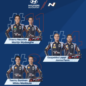 El equipo surcoreano alineará sus tres Hyundai i20 N Rally1 en manos de los belgas Thierry Neuville/Martijn Wydaeghe y de otros dos equipos de fineses Esapekka Lappi/Janne Ferm y Teemu Suninen/Mikko Markkula, que debutan esta temporada con un Rally1 en la categoría superior.