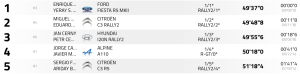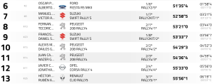 Novenos son Walter Delgado y Dani Sosa (Suzuki Swift R4lly S), cerrando las diez primeras posiciones Alexis Martín y Dailos González (Peugeot 208 Rally4), segundos de la Rally Cup, que superan en 7.1 a e Juan Carlos De la Cruz y Nazer Ghuneim (Peugeot 208 Rally4), equipos que mantendrá una lucha en el bucle final por el segundo puesto de la Rally Cup y acabar en el top 10.