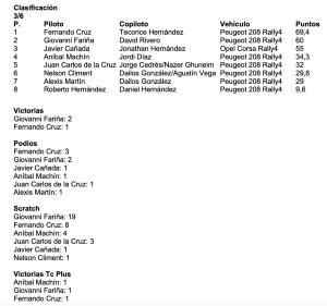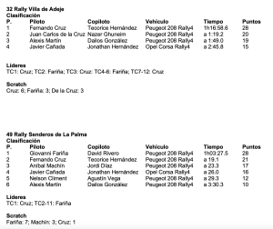 Pleno para los del Peugeot 208 Rally4, que a su triunfo en el Rally Villa de Adeje han sumado la victoria en el TC Plus. Giovanni y Carolina Fariña, que llegaban líderes al ecuador del campeonato, tuvieron que abandonar en la segunda etapa, situándose ahora en la segunda posición del certamen de Sports & You Canarias. Juan Carlos de la Cruz- Nazer Ghuneim y Alexis Martín-Dailos González han completado el podio en esta tercera prueba del año.