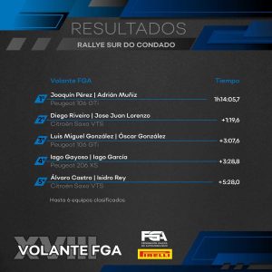 Álvaro Castro que no pudo remontar ni una sola plaza fruto de su sangría de tiempo por culpa del pinchazo, teniendo además problemas para encender su vehículo durante toda la jornada, lo cual complicaba los enlaces. Vanessa Guisande lograba completar esta difícil prueba en la sexta plaza, cerrando la clasificación.