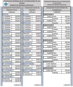 La cuantía total es de 23.500 euros y queda repartida de la siguiente manera en los campeonatos: 6.000 euros (rallys de asfalto), 3.000 euros (rallysprints), 1.500 euros (rallys regularidad sport), 3.000 euros (montaña), 1.000 euros (RS montaña), 3.000 euros (rallys de tierra), 2.000 (slaloms), 2.000 euros (campeonato insular de Lanzarote) y 2.000 euros (campeonato insular de slaloms de Fuerteventura).