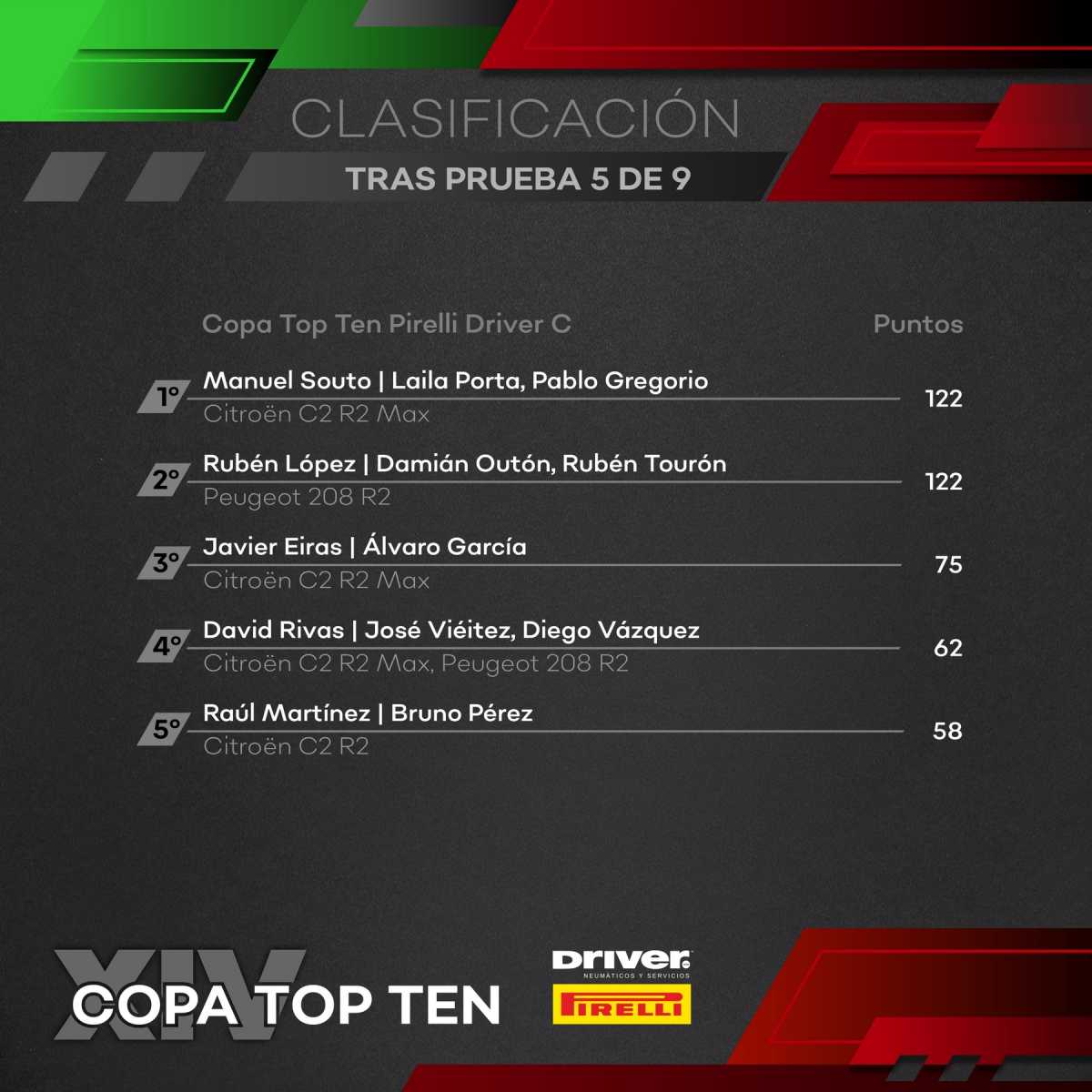 En lo que respecta a la Top Ten «C», se presenció un intenso duelo por el liderato entre Raúl Martínez, ganador en Pontevedra, y Rubén López, vencedor en el Mariña Lucense, y que aquí pilotaba otra unidad de Peugeot 208 R2 distinta a la habitual. La batalla fue encarnizada hasta que Martínez sufría problemas mecánicos, debiendo retirarse. López, acompañado por Damián Outón, lograba así la segunda victoria de la temporada, administrando la ventaja sobre Javier Estévez, que en un último ataque estuvo a punto de dar la sorpresa, quedándose a sólo 8 segundos del equipo de Sarria. En un rallye complicado donde se equivocaba con la monta de neumáticos al inicio, Manuel Souto sólo pudo finalizar tercero, viendo como ahora comparte el liderato del certamen con Rubén López, empatados a puntos a falta de cuatro carreras.
